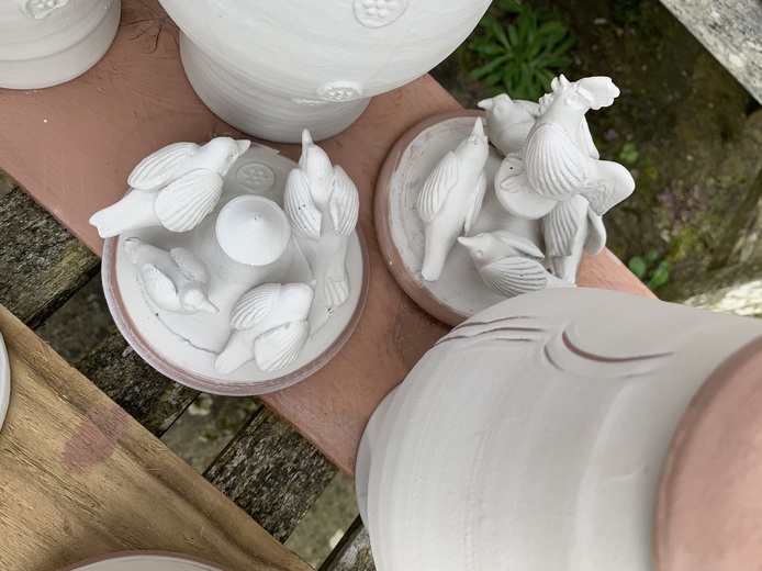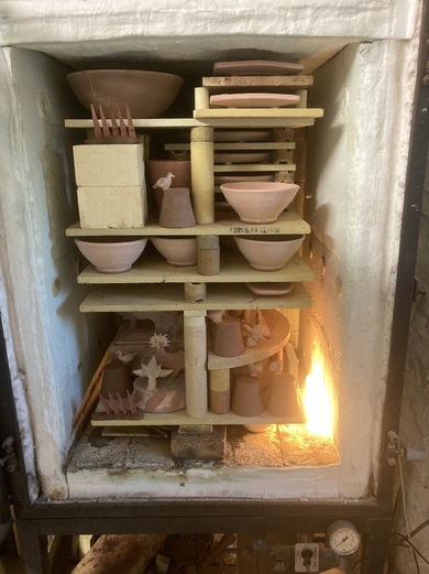 The pots are allowed to dry to bone hard before they are glazed. I raw glaze, so there is no biscuit firing (except for a handful of the most delicate sculptural pieces). Raw glazing bone dry pots works for me. When fully dry the pots are fired in a gas kiln to around 1100 degrees C, taking about 14 hours.